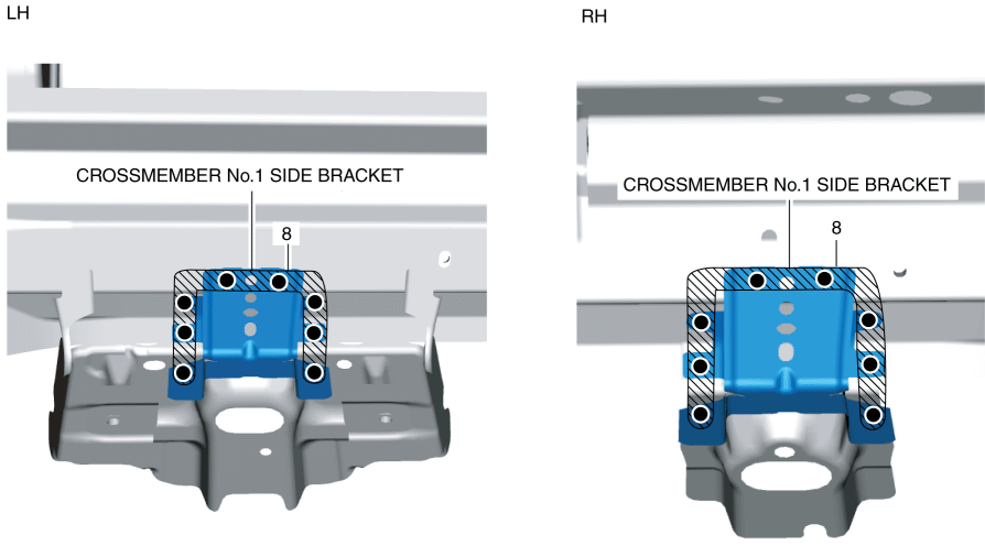 3. Drill the 8 locations indicated shown in the figure, then remove the crossmember No.1 side bracket.