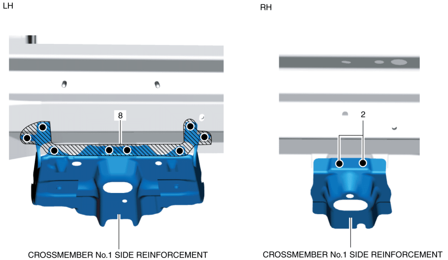 4. Drill the 8 locations (LH), 2 locations (RH) indicated shown in the figure, then remove the crossmember No.1 side reinforcement.< Previous Next >