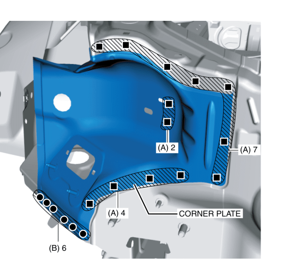 5. Spot weld the 6 locations indicated by (B) shown in the figure, then install the corner plate.< Previous Next >