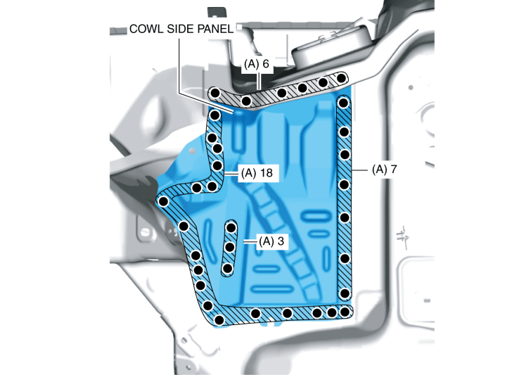 1. Drill the 34 locations indicated by (A) shown in the figure, then remove the cowl side panel.