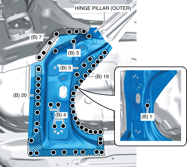 2. Drill the 56 locations indicated by (B) shown in the figure, then remove the hinge pillar (outer).