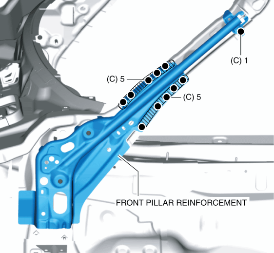 3. Drill the 11 locations indicated by (C) shown in the figure, then remove the front pillar reinforcement.