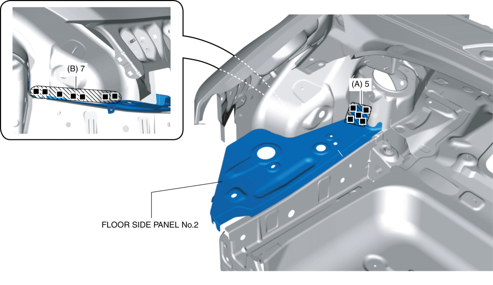 5. Plug weld the 7 locations indicated by (B) from front wheel housing shown in the figure, then install the floor side panel No.2.