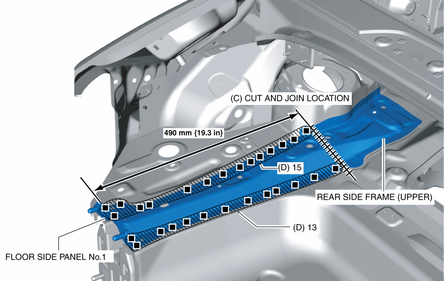 7. Plug weld the 28 locations indicated by (D) shown in the figure, then install the rear side frame (upper) and floor side panel No.1.< Previous Next >