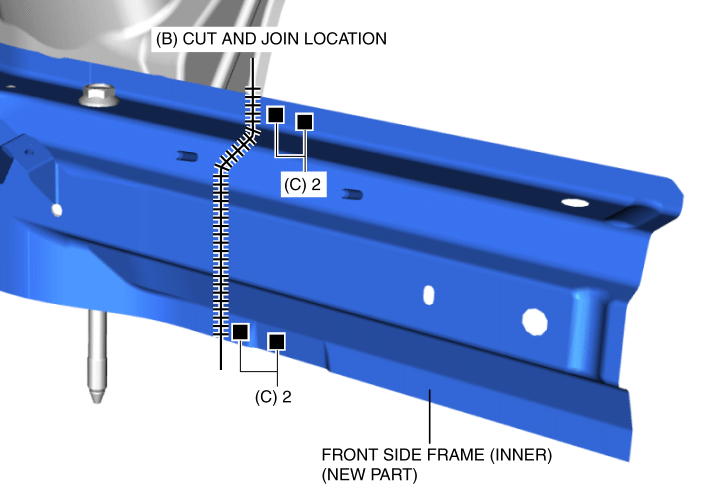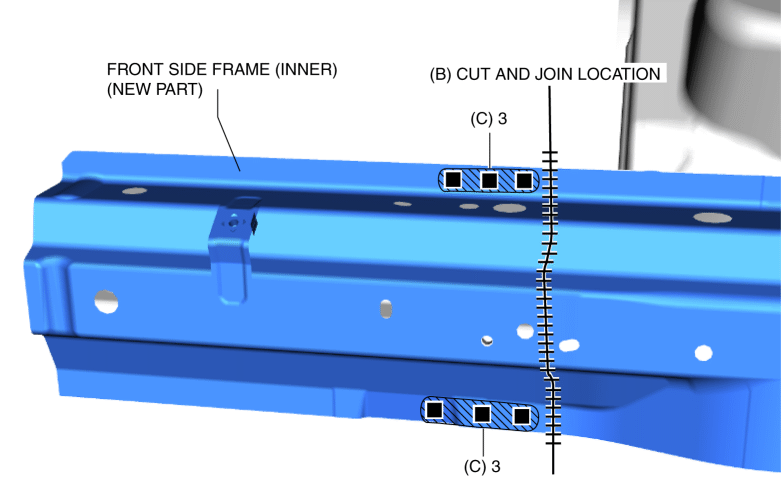 6. Plug weld the 4 locations indicated by (C) shown in the figure, then install the new part of front side frame (inner).