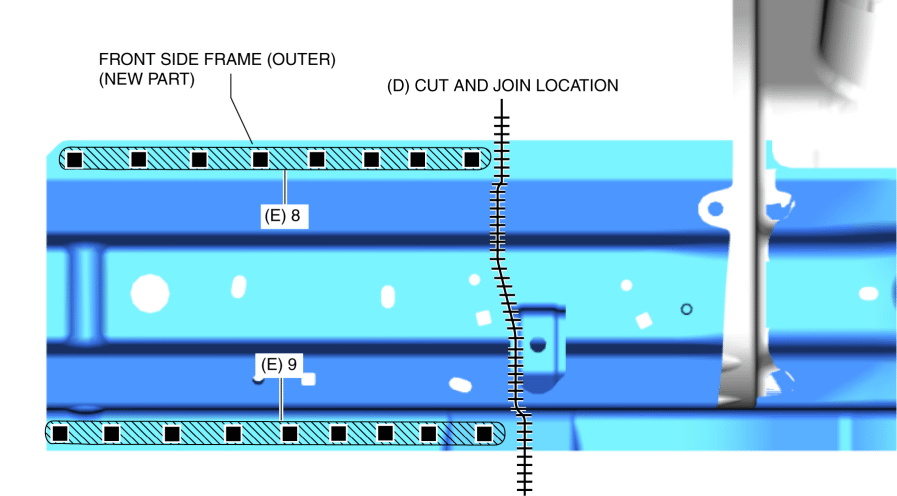 8. Plug weld the 17 locations indicated by (E) shown in the figure, then install the new part of front side frame (outer).