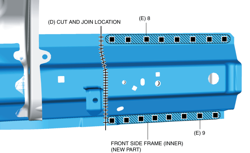 8. Plug weld the 17 locations indicated by (E) shown in the figure, then install the new part of front side frame (inner).