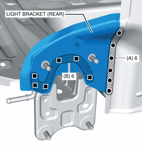 5. Plug weld the 6 locations indicated by (B) shown in the figure, then install the light bracket (rear).< Previous Next >