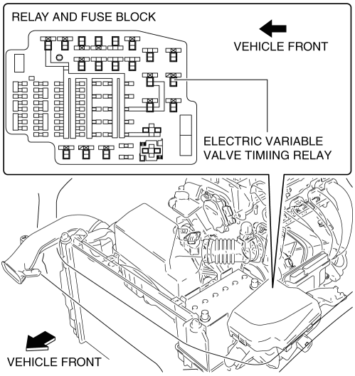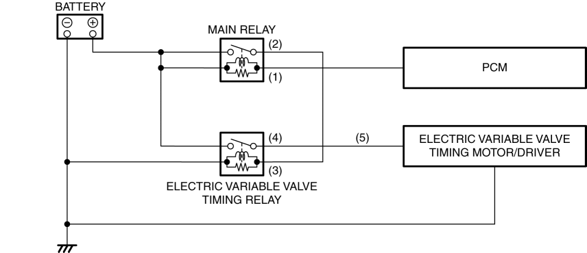 The electric variable valve timing relay operates by the battery voltage after main relay energization, and supplies battery voltage to the electric variable timing motor/driver.