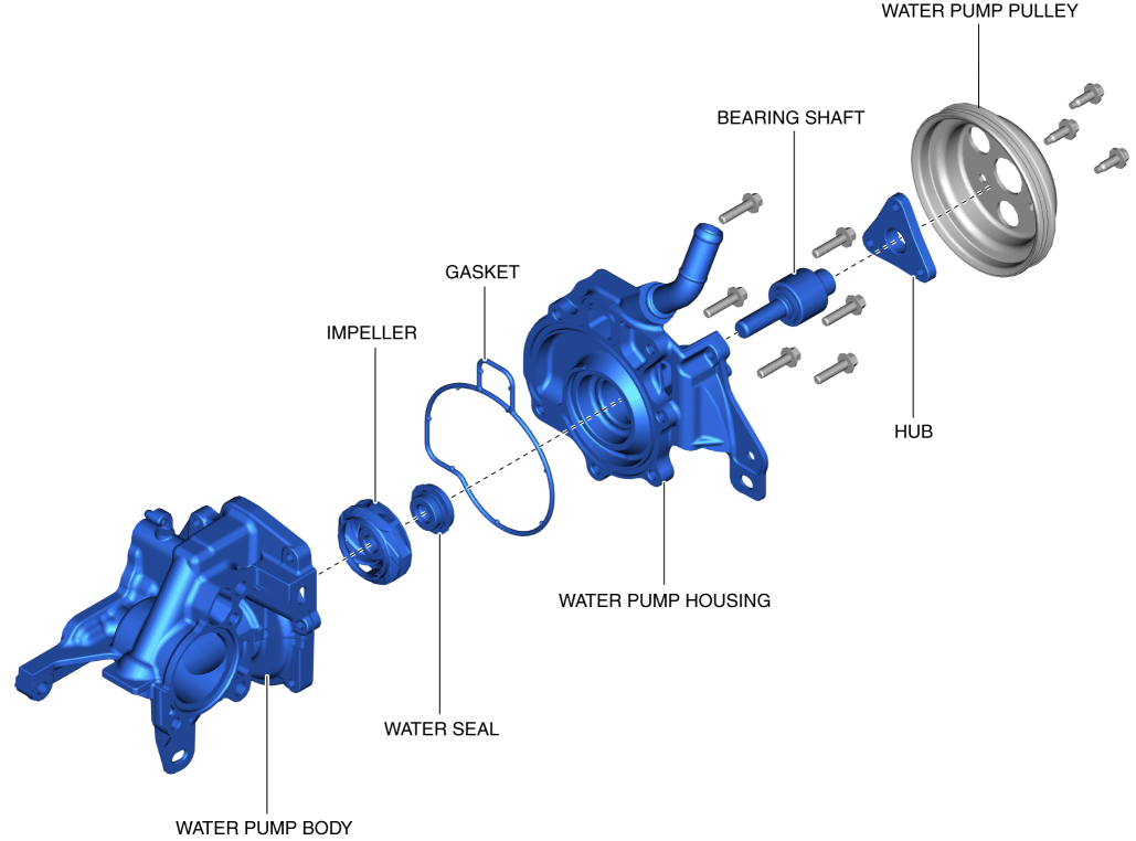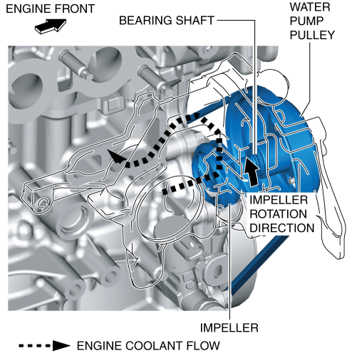 2. The impeller with the water pump pulley and shaft connected rotates to pump engine coolant.< Previous Next >
