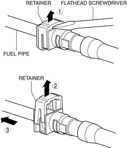 When removing the fuel hose, remove the retainer using a flathead screwdriver as shown in the figure.