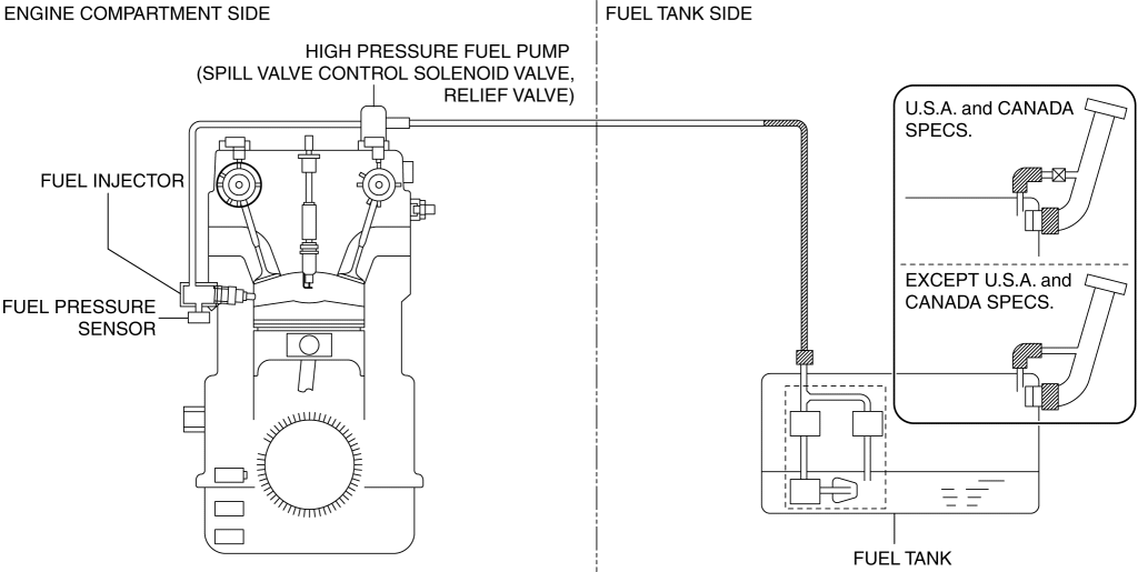 Fuel pressure is adjusted by the spill valve control solenoid valve, and a relief valve in the high pressure fuel pump is equipped to ensure safety in case of a malfunction. When the fuel pressure exceeds the specified value, the relief valve opens to prevent the fuel pressure from increasing. For details on the high pressure fuel pump, refer to the [HIGH PRESSURE FUEL PUMP] for the fuel system. (See HIGH PRESSURE FUEL PUMP [SKYACTIV-G 2.0].)