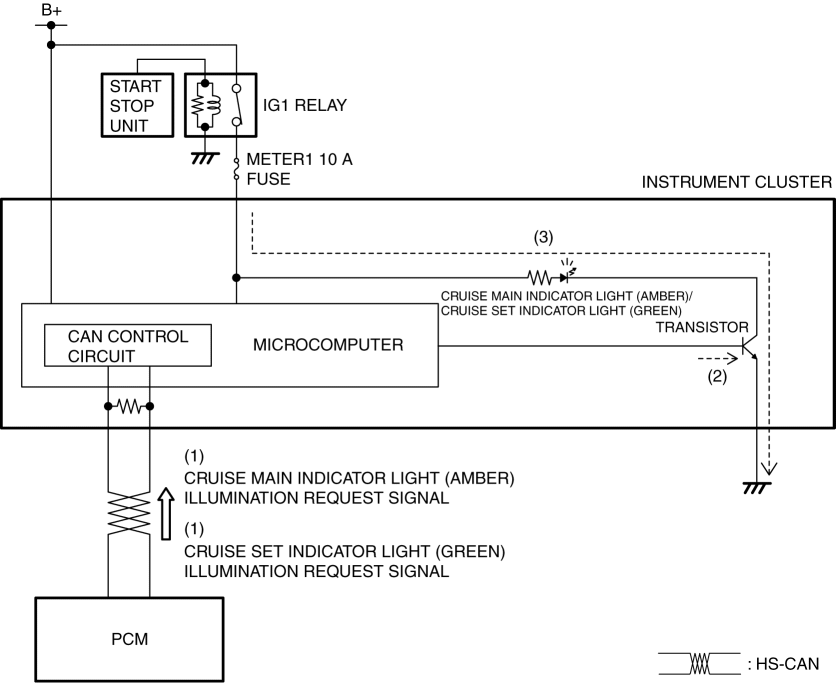 1. The instrument cluster receives (1) a cruise main indicator light (amber) or cruise set indicator light (green) illumination request signal from the PCM via CAN communication.