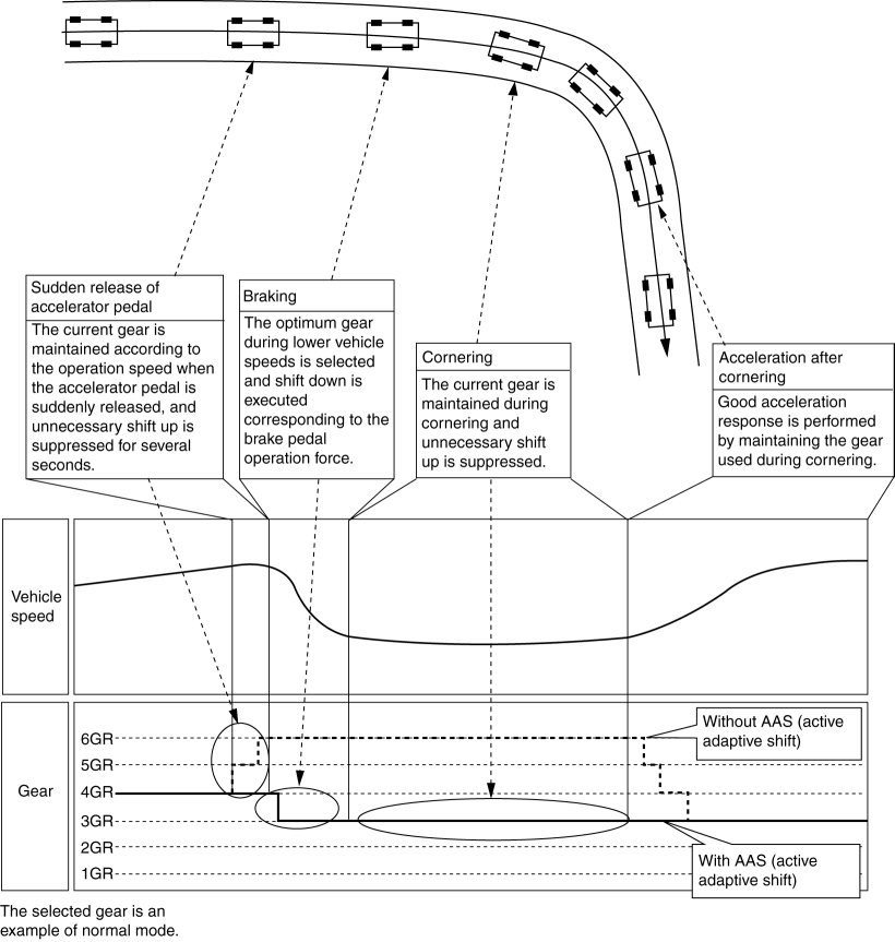 When SPORT mode is selected, the AAS selects a lower gear compared to when normal mode is selected, and maintains it for a longer period of time. (with drive selection switch)
