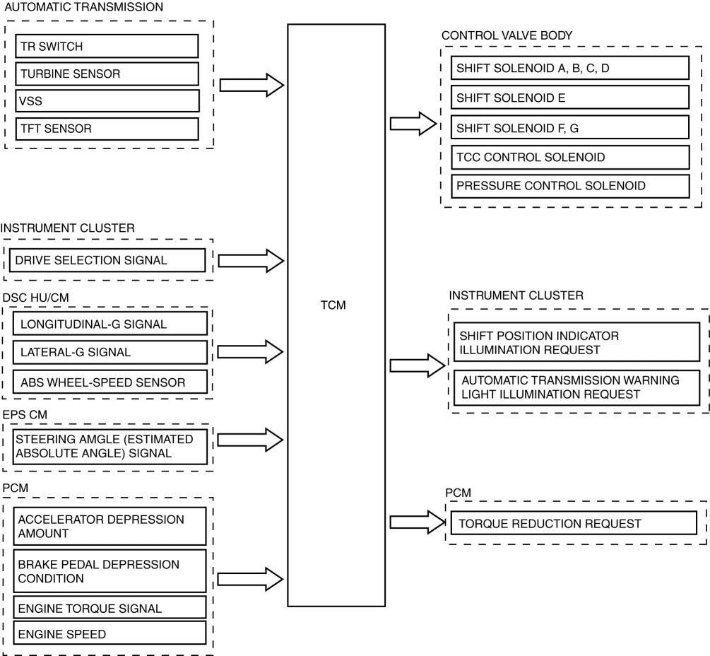 The TCM implements auto shift control according to the vehicle speed and accelerator pedal depression amount while in D position.