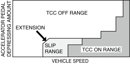 By sliding the TCC piston when TCC is in the OFF range, slip control extends the TCC range to low vehicle speeds. This suppresses a rise in engine speed and increases transmission efficiency, improving fuel economy. At the same time, through the sliding of the TCC piston, engine vibration can be absorbed by the torque converter.