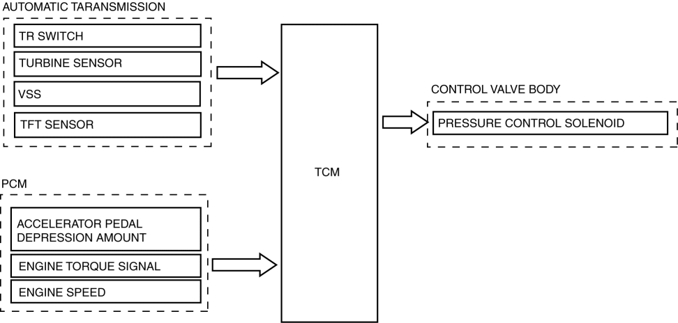The TCM adjusts the pressure control solenoid pressure applied to the pressure regulator valve by increasing/decreasing the energization current to the pressure control solenoid. As a result, the ATF amount passing through the pressure regulator valve is adjusted and the line pressure is adjusted.