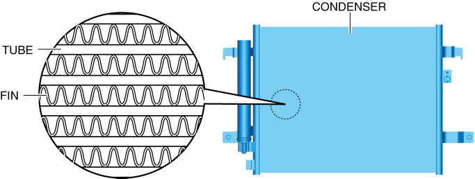 The condenser cools the high temperature, high pressure gaseous refrigerant circulating internally using airflow from the exterior and changes it to low temperature, high pressure liquid refrigerant.