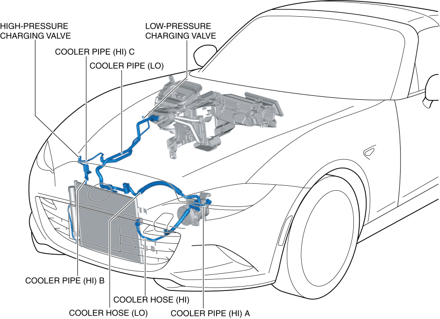A high-pressure charging valve is located on cooler pipe (HI) C and a low-pressure charging valve is located on the cooler pipe (LO).