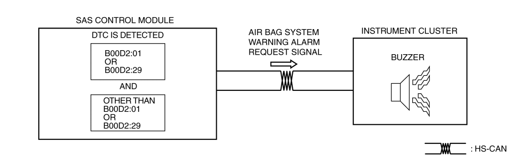 When the SAS control module detects DTC B00D2:01 or B00D2:29 (air bag/seat belt pre-tensioner system warning light (transmission related error)), it sends an air bag system warning alarm request signal to the instrument cluster if DTCs other than DTC B00D2:01 or B00D2:29 (except DTCs which do not turn on air bag/seat belt pre-tensioner system warning light) are detected.