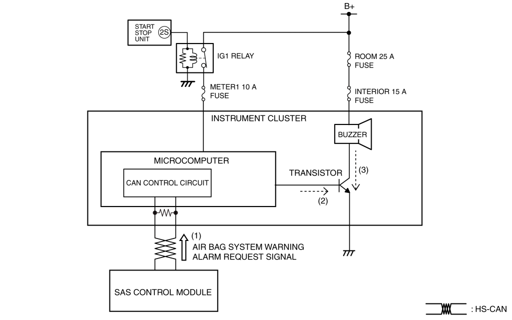 3. When the transistor turns on, a ground circuit with the air bag system warning alarm is established and the buzzer activates (3).