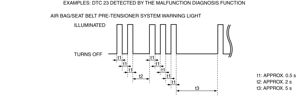 The air bag/seat belt pre-tensioner system warning light displays DTCs by the flashing/being illuminated.