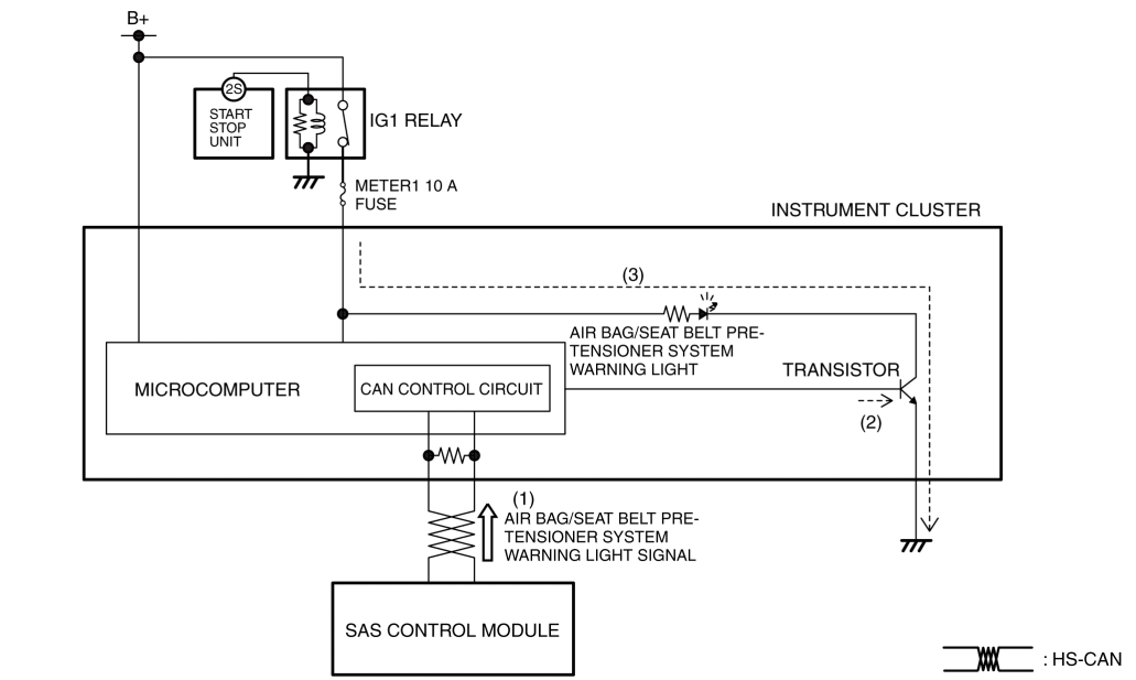 1. When the ignition is switched ON (engine off or on), the instrument cluster receives (1) the air bag/seat belt pre-tensioner system warning light request signal from the SAS control module.
