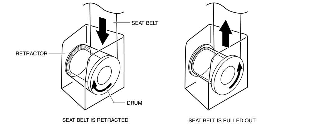 For the three-point seat belt, the seat belt is secured to the drum in the retractor and wrapped.