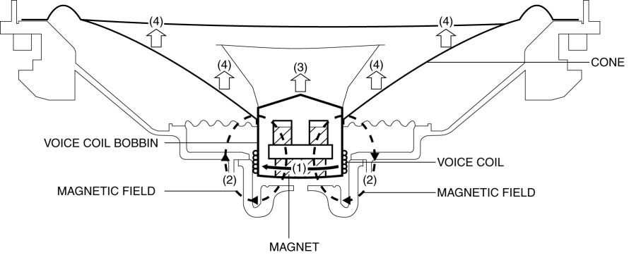 When the audio signal (current) is sent to the voice coil, the coil becomes magnetized and a magnetic field occurs. Because the voice coil and the magnet pull and repel each other in the magnetic field, the voice coil vibrates.