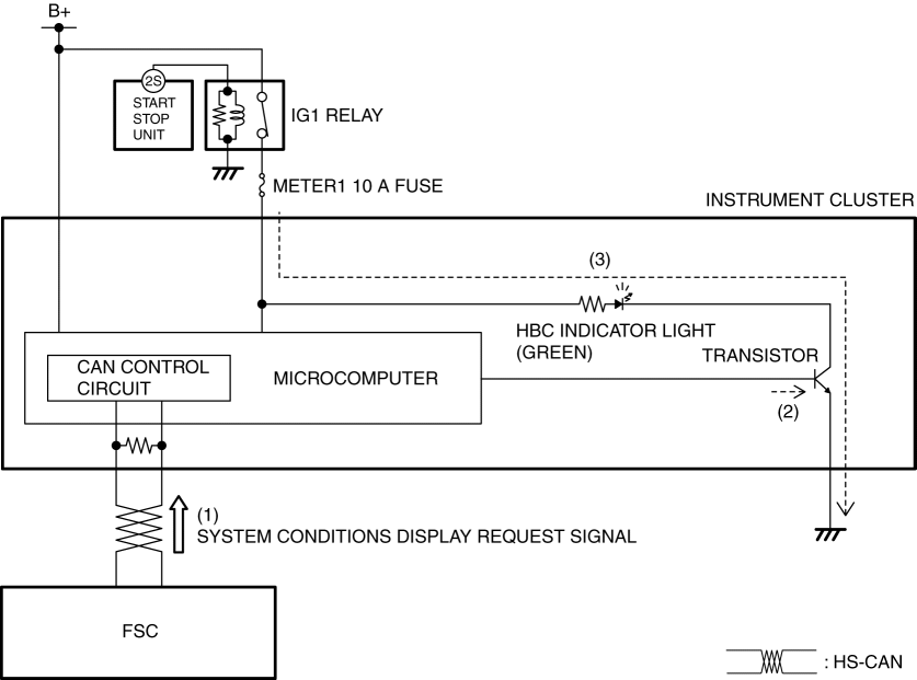 When the high beam control (HBC) system operates, the forward sensing camera (FSC) sends (1) a system condition display request signal to the instrument cluster via CAN communication.