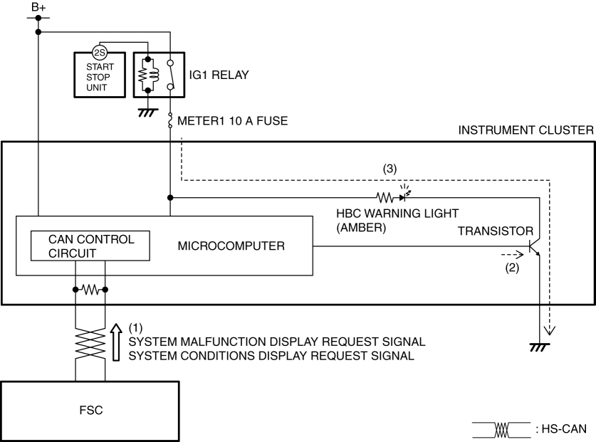 If there is a malfunction in the high beam control (HBC) system, the forward sensing camera (FSC) sends (1) a system malfunction display request signal or system condition display request signal to the instrument cluster via CAN communication.