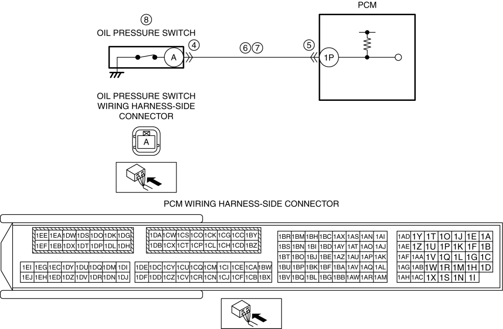 Refer to the wiring diagram and verify whether or not there is a common connector between oil pressure switch terminal A and PCM terminal 1P.