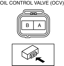 5. Apply battery positive voltage between the OCV terminals and verify that the spool valve operates and moves to the maximum valve timing retard position.