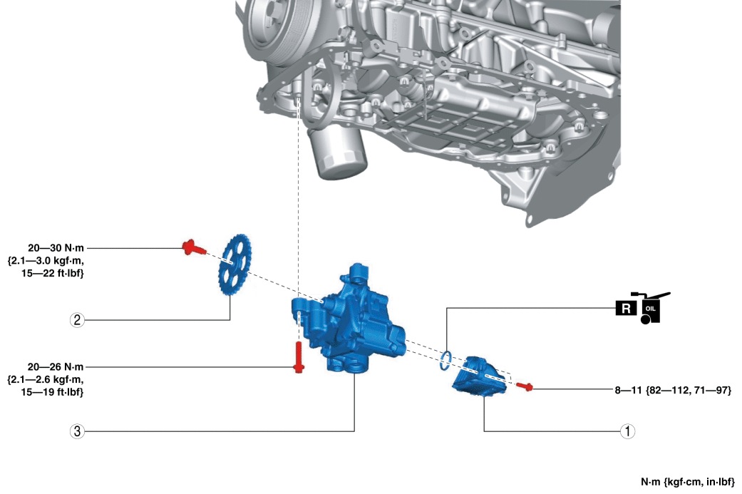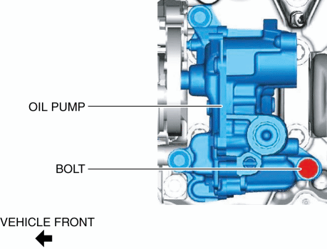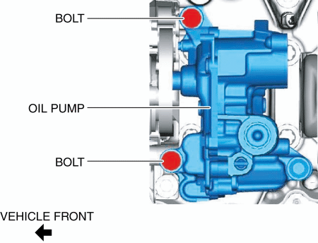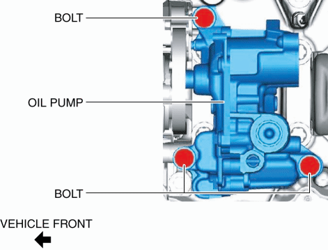 1. Install the oil pump using the following procedure:a. Temporarily tighten the three bolts shown in the figure.b. Tighten the two bolts shown in the figure to the specified torque.NOTE: