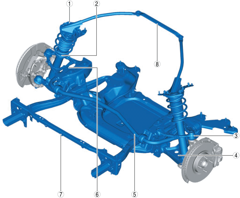 Front shock absorber and coil spring (See FRONT SHOCK ABSORBER AND COIL SPRING REMOVAL/INSTALLATION.) (See FRONT SHOCK ABSORBER AND COIL SPRING DISASSEMBLY/ASSEMBLY.) |
