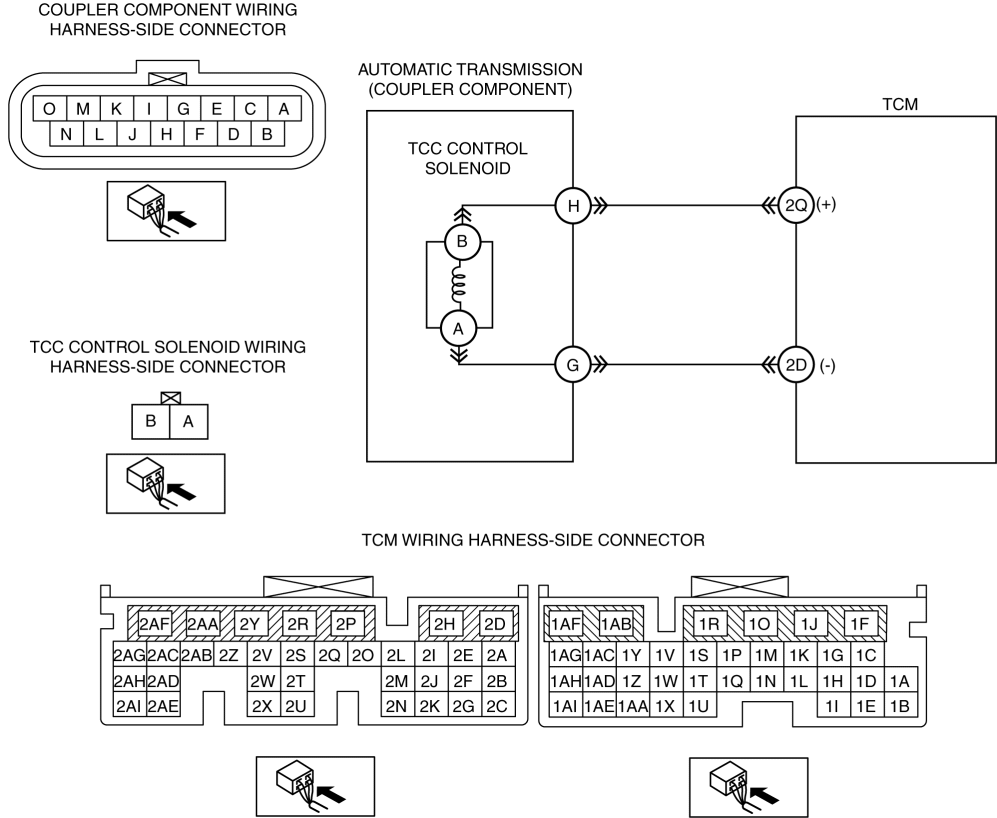 Repair or replace the wiring harness (coupler component connector—TCC control solenoid) for short to power supply, then go to the next step. |