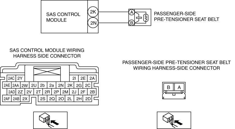 Refer to the wiring diagram and verify whether or not there is a common connector between SAS control module terminal and passenger-side pre-tensioner seat belt terminal.