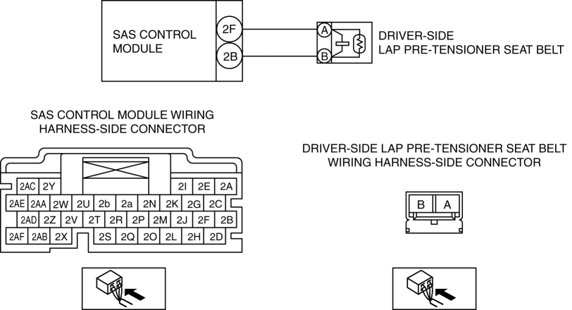 Refer to the wiring diagram and verify whether or not there is a common connector between SAS control module terminal and driver-side lap pre-tensioner seat belt terminal.