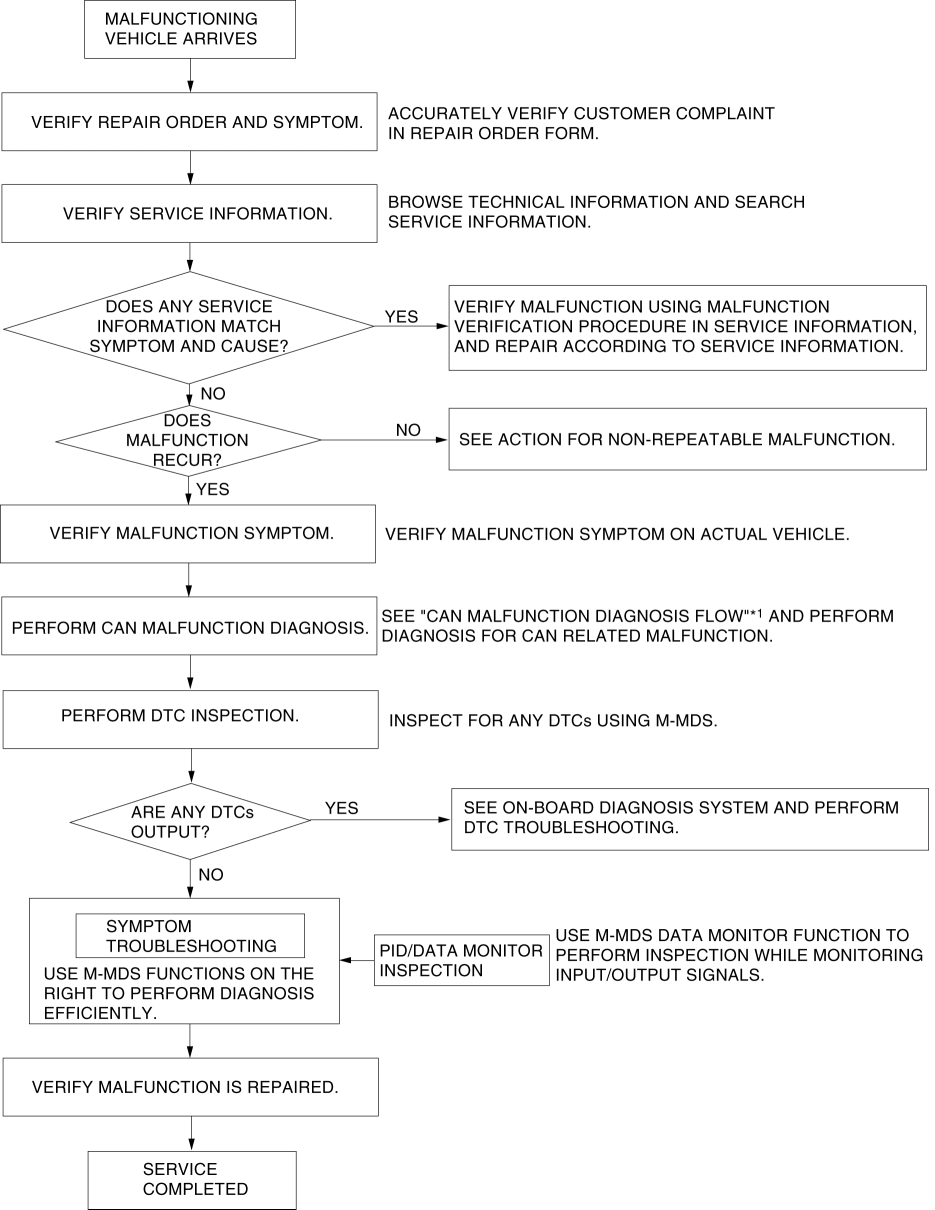 If there is any vehicle malfunction complaint lodged by a customer, perform malfunction diagnosis according to the troubleshooting procedure.