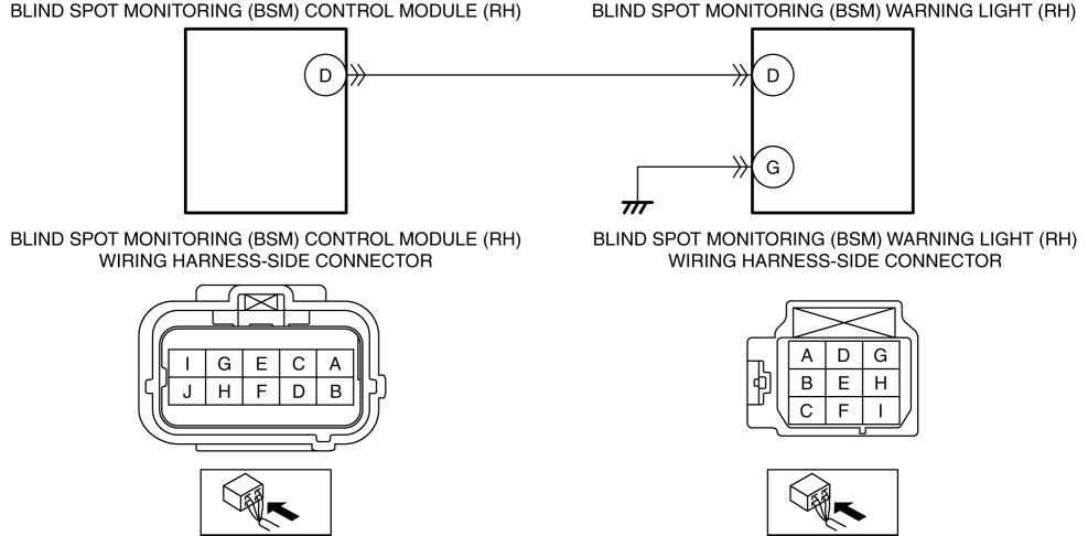 Refer to the wiring diagram and verify whether or not there is a common connector between blind spot monitoring (BSM) control module (RH) terminal D and blind spot monitoring (BSM) warning light (RH) terminal D.