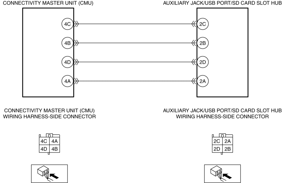 INSPECT AUXILIARY JACK/USB PORT/SD CARD SLOT HUB CIRCUIT FOR OPEN CIRCUIT