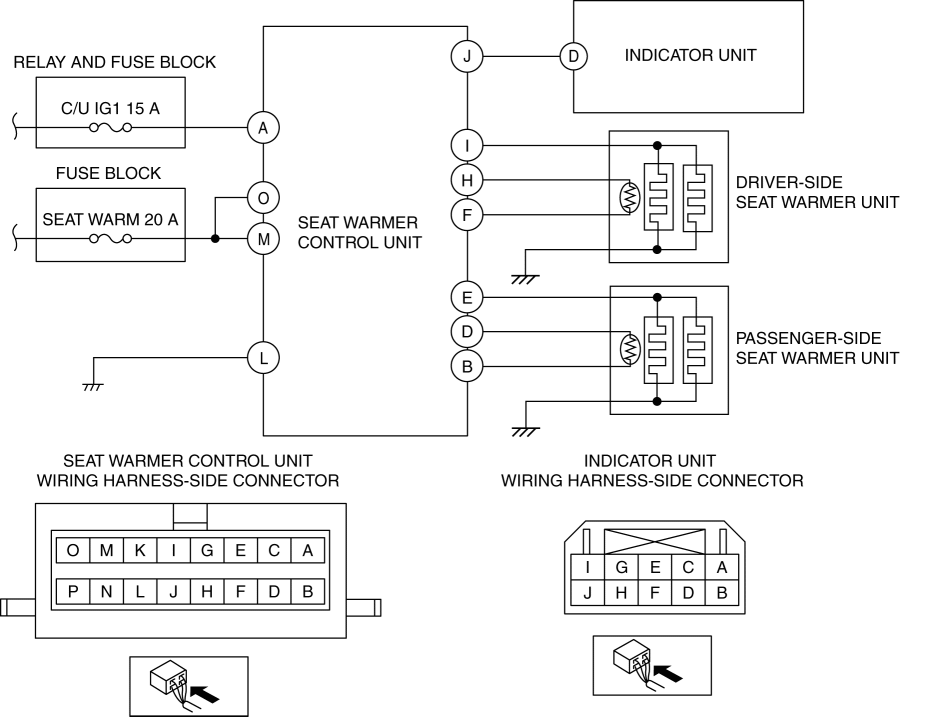 VERIFY IF MALFUNCTION CAUSE IS SHORT CIRCUIT TO GROUND IN WIRING HARNESS BETWEEN SEAT WARMER CONTROL UNIT AND INDICATOR UNIT