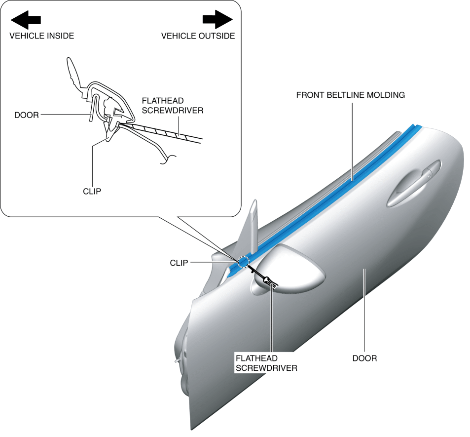 4. Insert a small tape-wrapped flathead screwdriver into the position shown in the figure, and detach the front beltline molding clip from the door.