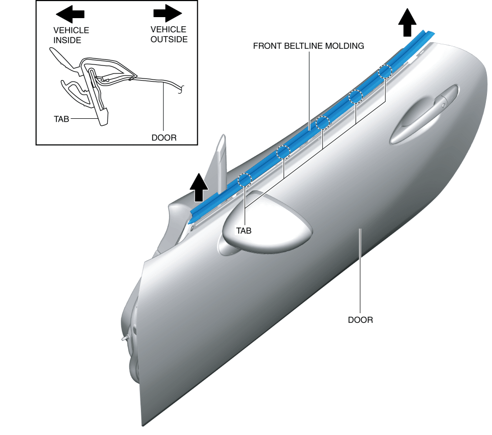 5. Pull up the front beltline molding in the direction of the arrows shown in the figure and detach the front beltline molding tabs from the door.