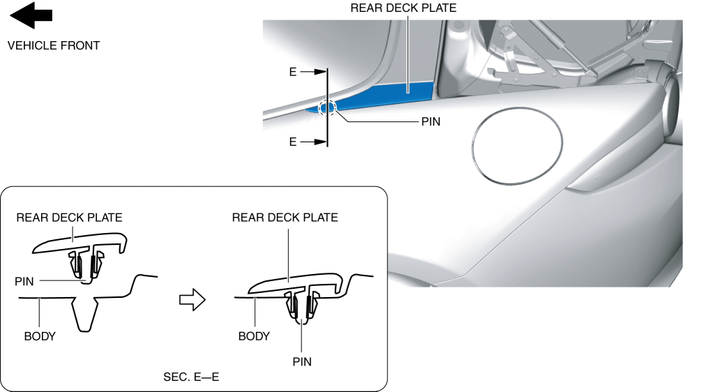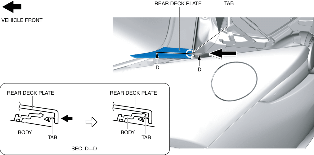 4. Press the rear deck plate in the direction of the arrow shown in the figure and attach the rear deck plate tab to the body.