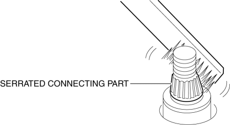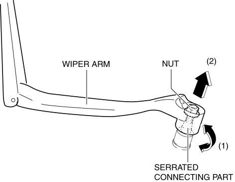 7. Move the wiper arm in the direction of arrow (1) shown in the figure and detach it from the serrated connecting part.