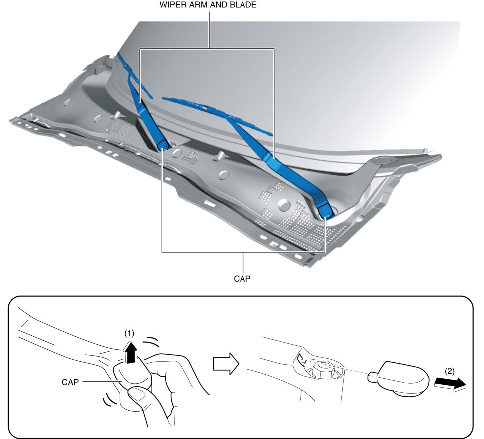 3. Remove the cap from the wiper arm by pulling the cap in the direction of arrow (2) shown in the figure.
