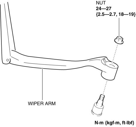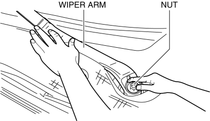 If the wiper arm is pulled up with the nut completely removed, the wiper arm could contact the hood when it is removed. Always pull up the wiper arm with the nut not completely removed.