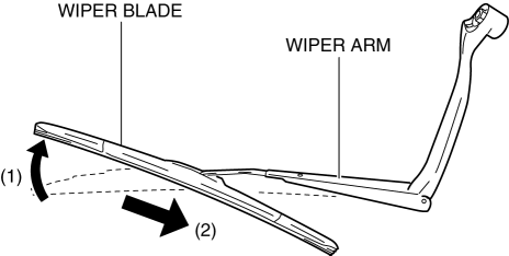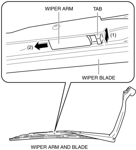 1. While pressing the wiper blade tab in the direction of arrow (1) shown in the figure, press the wiper arm in the direction of arrow (2) and detach the wiper blade from the wiper arm.