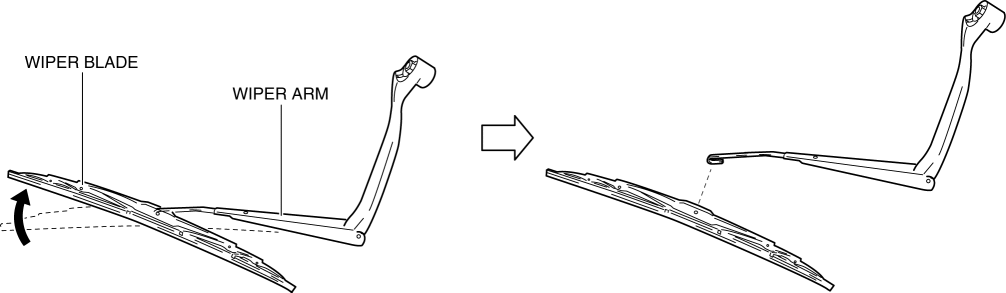 2. Tilt the wiper blade in the direction of the arrow shown in the figure and remove it from the wiper arm.